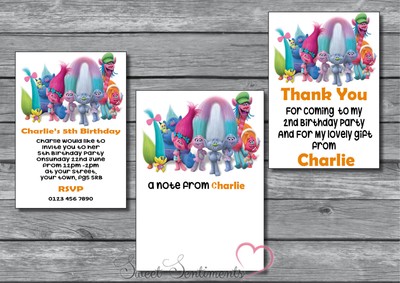 Personalised Trolls Birthday Party Invites Notes Thank You Cards